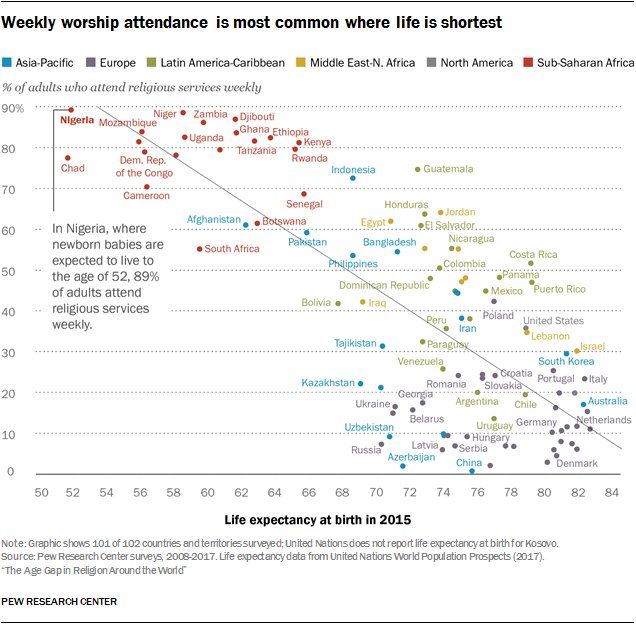 Weekly worship attendance is most common in countries where life expectancy at birth is shortest https://t.co/KhNYwzVoQp