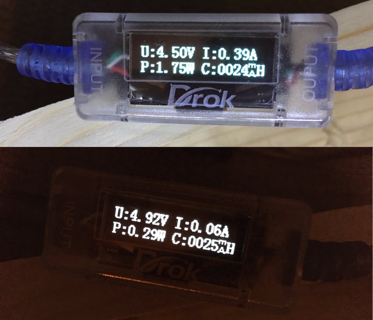 USB light strip power draw, 1.46W, 0.33A. The arcade controller brain draws 0 power, apparently. 0.29W/0.06A is hub! https://t.co/3MtXOk4P7E