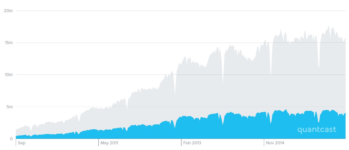 Stack Overflow Quantcast traffic 2009-present. The giant drops are Xmas. The sags are summers. https://t.co/8gMscQ6VU2