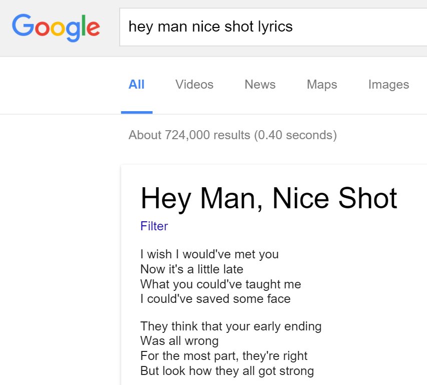 Google is fully oneboxing song lyrics now? gg crappy ad-infested lyrics sites https://t.co/Y5Y4fxxIo4