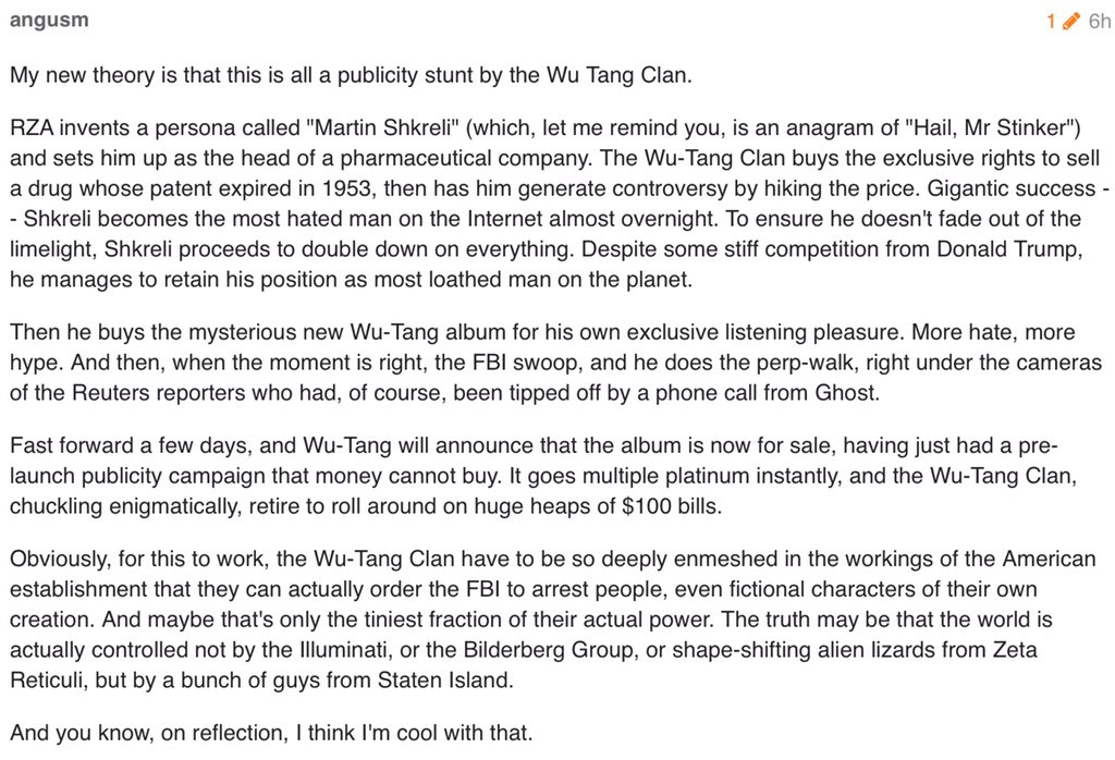 Shkreli as an elaborate Wu-Tang publicity stunt. Mind = blown https://t.co/afzNTpI4gB
