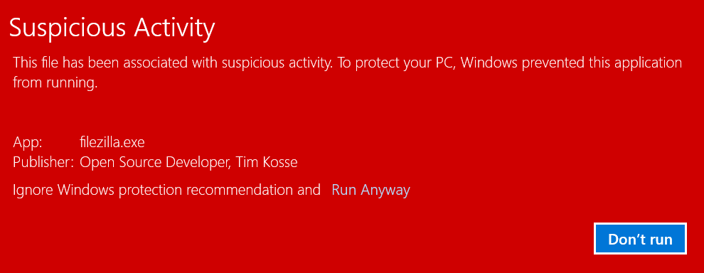 even downloading the non-installer version of filezilla, and running filezilla.exe, produces "suspicious activity" http://t.co/WKkeZwlnAN