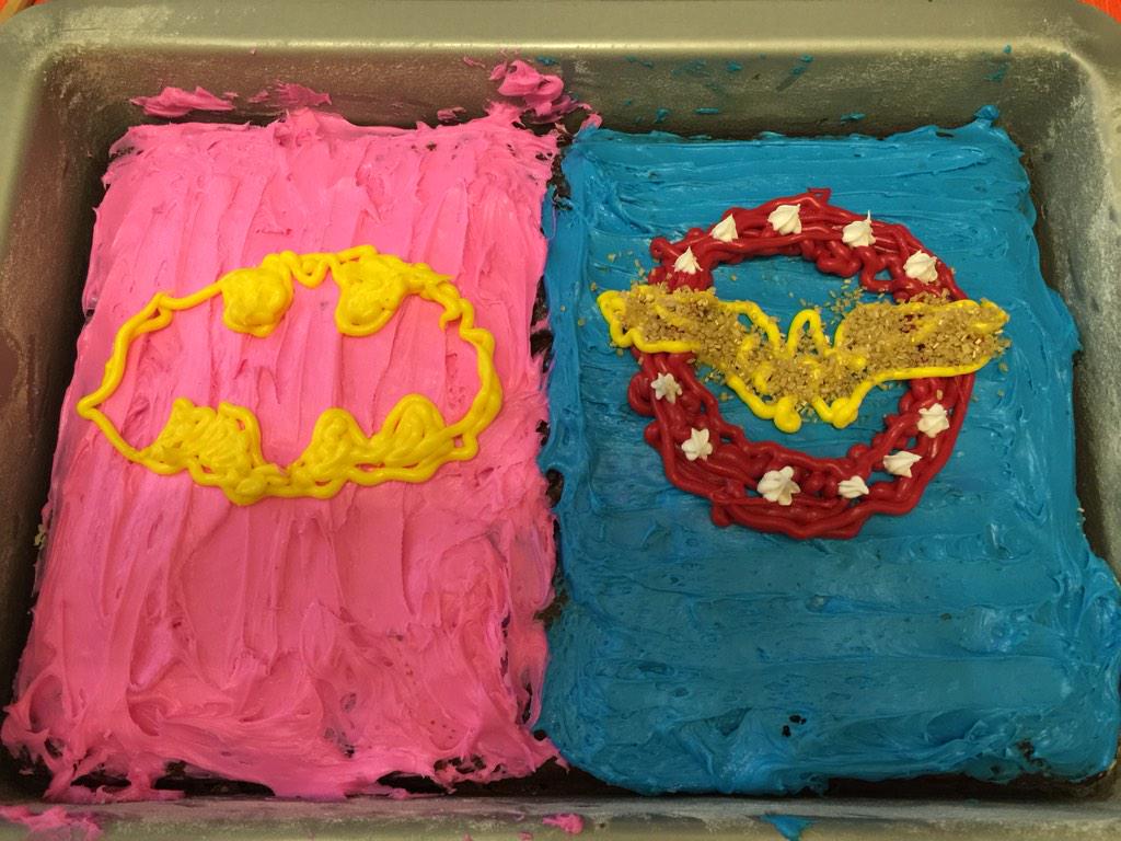 My son and I made a combo Batgirl / Wonder Woman cake for our twin girls who turn 3 today http://t.co/DHh0MhgY3Z