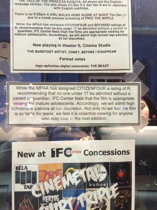 Notice posted outside the NYC theater where I just saw @citizenfour. Cc @ioerror. http://t.co/i4hvabjTe3