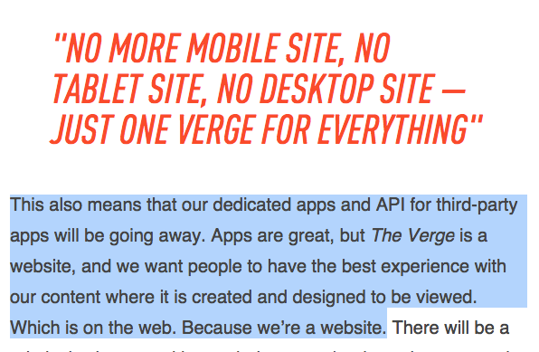 The Verge goes all-in on responsive web and is nuking their native apps: http://t.co/pnSaRExBFp http://t.co/XVPUque7HB