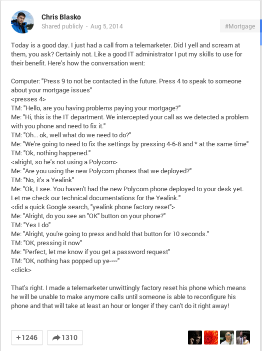 Guy calls a telemarketer back and tricks them into resetting their phone http://t.co/Bsa6WJll3g