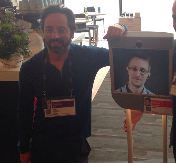 Edward Snowden - now with a #TED2014 badge - wanders the halls & runs into Sergey Brin at #TED https://t.co/uOHz8KLDdt