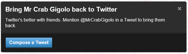 What say you @MrCrabGigolo ? Will you come back to Twitter? The world needs more crab gigolo wisdom. http://t.co/QArBzoRu