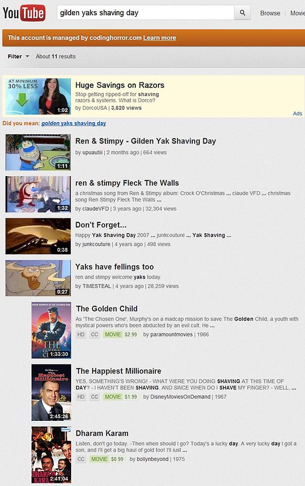 YouTube inserting craptastic movie "search hits" into my search results is not making them better. Quite the opposite. http://t.co/o9SLrnjY