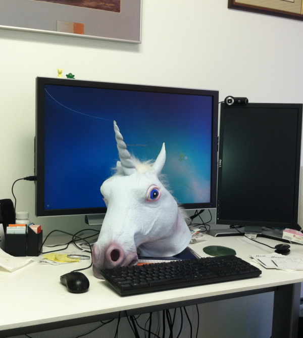 Somebody is trying to tell me something. I woke up with a Unicorn head on my desk this morning. http://t.co/8wKlgybO
