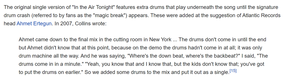 TIL a music exec forced Phil Collins to add crappy drum fills to the original single version of In the Air Tonight, because of course he did https://t.co/Jr7cqAAZn2 https://t.co/DCtSSIMNv4