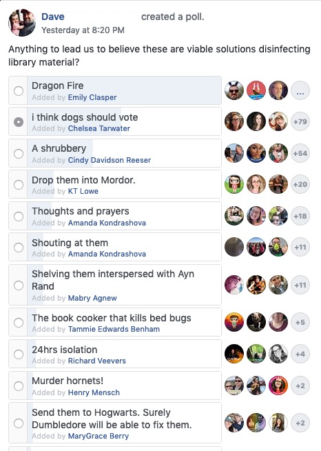 Library grabass poll: what's really going to disinfect those returned library books properly? https://t.co/CCrDejlHfW