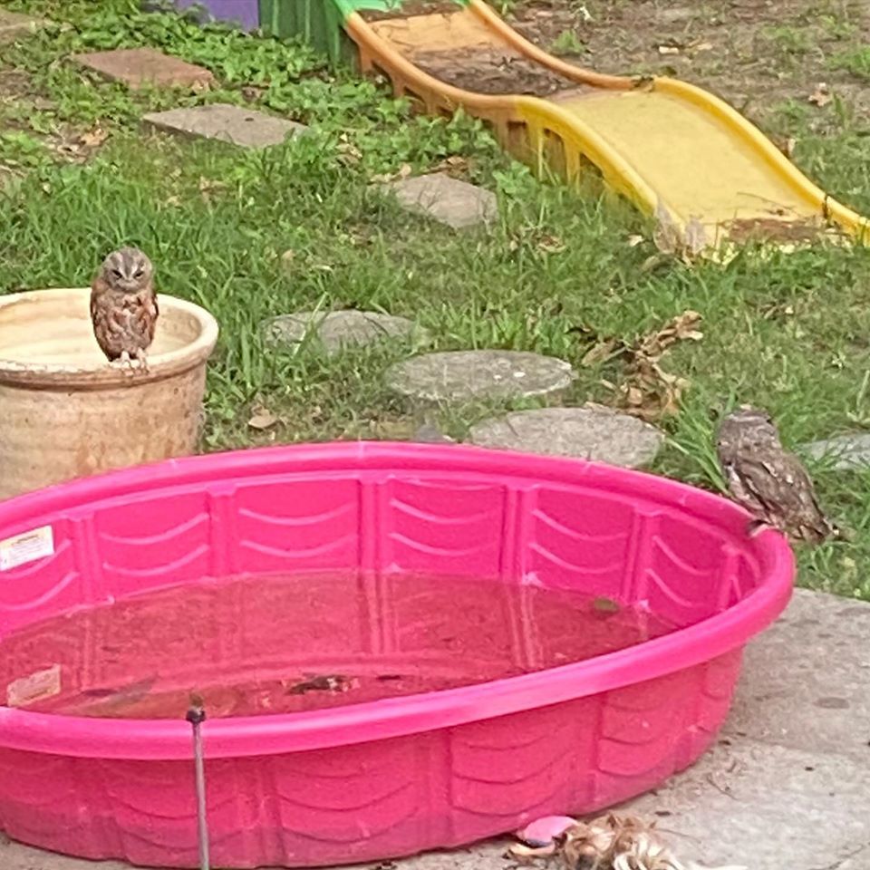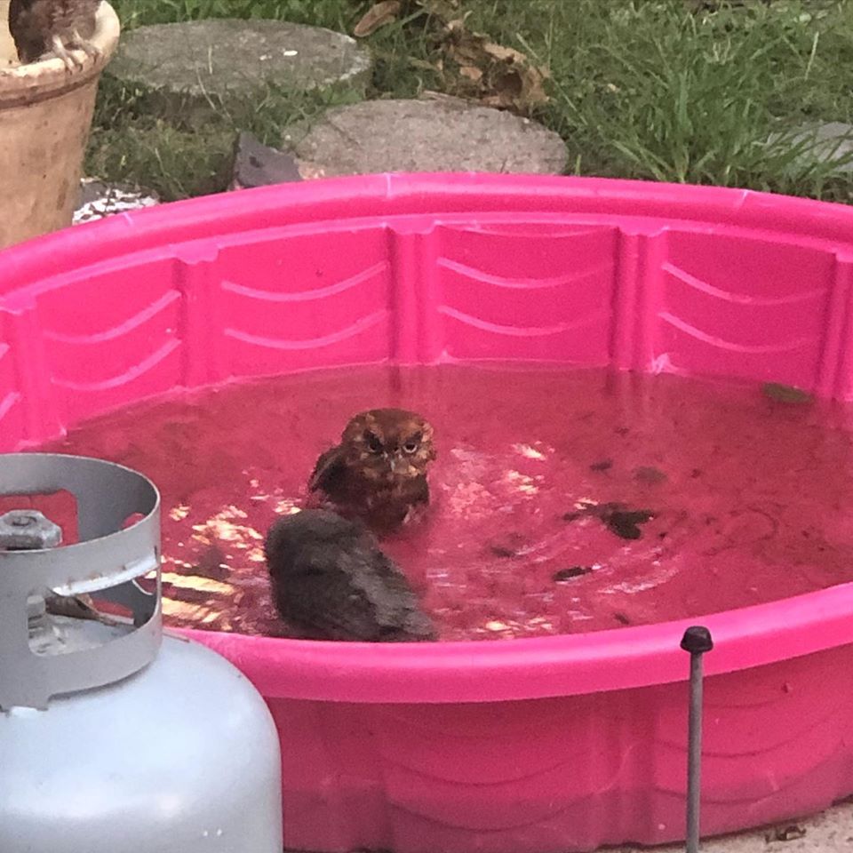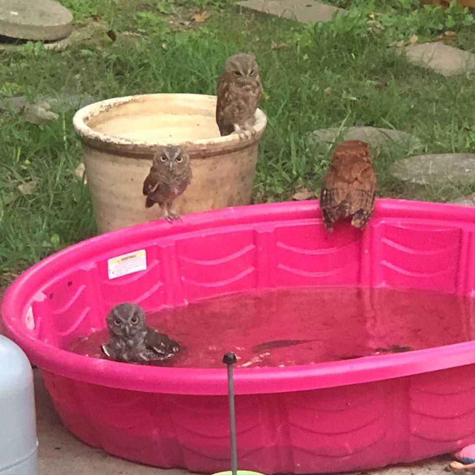 a family of 6 little owls took over my friend's back yard? owl POOL PARTY????? https://t.co/XlFwLmfYGo