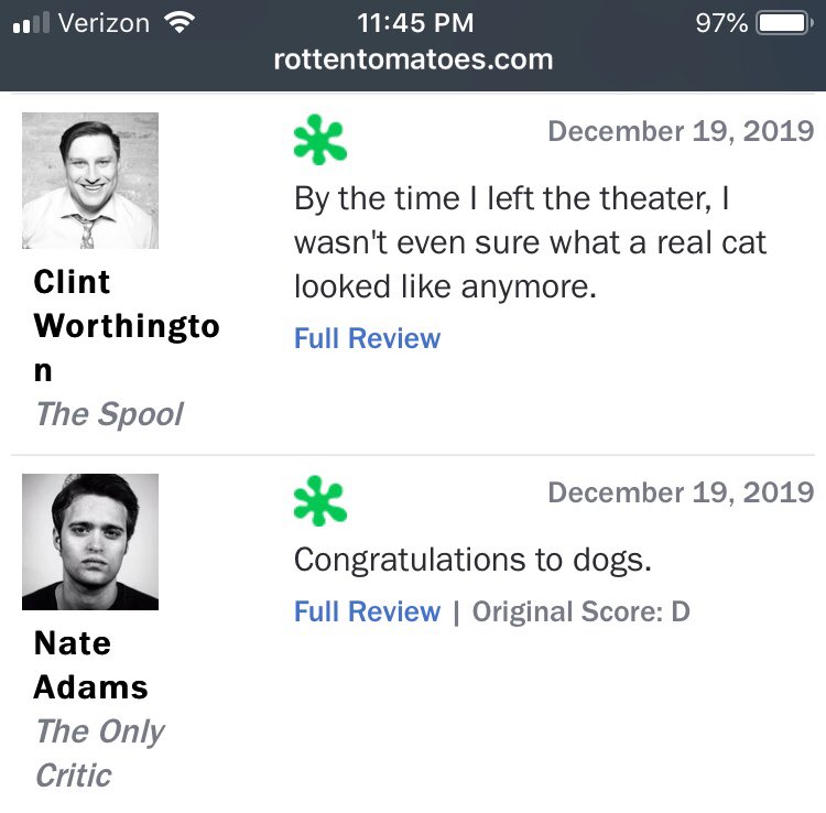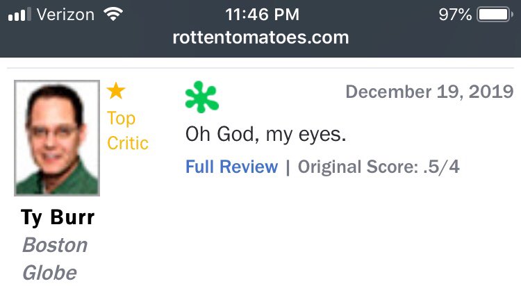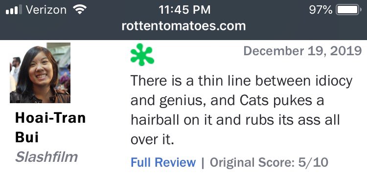 The reviews for Cats are in (17% on rotten tomatoes), and they are spectacular. https://t.co/7BHcki7ld9
