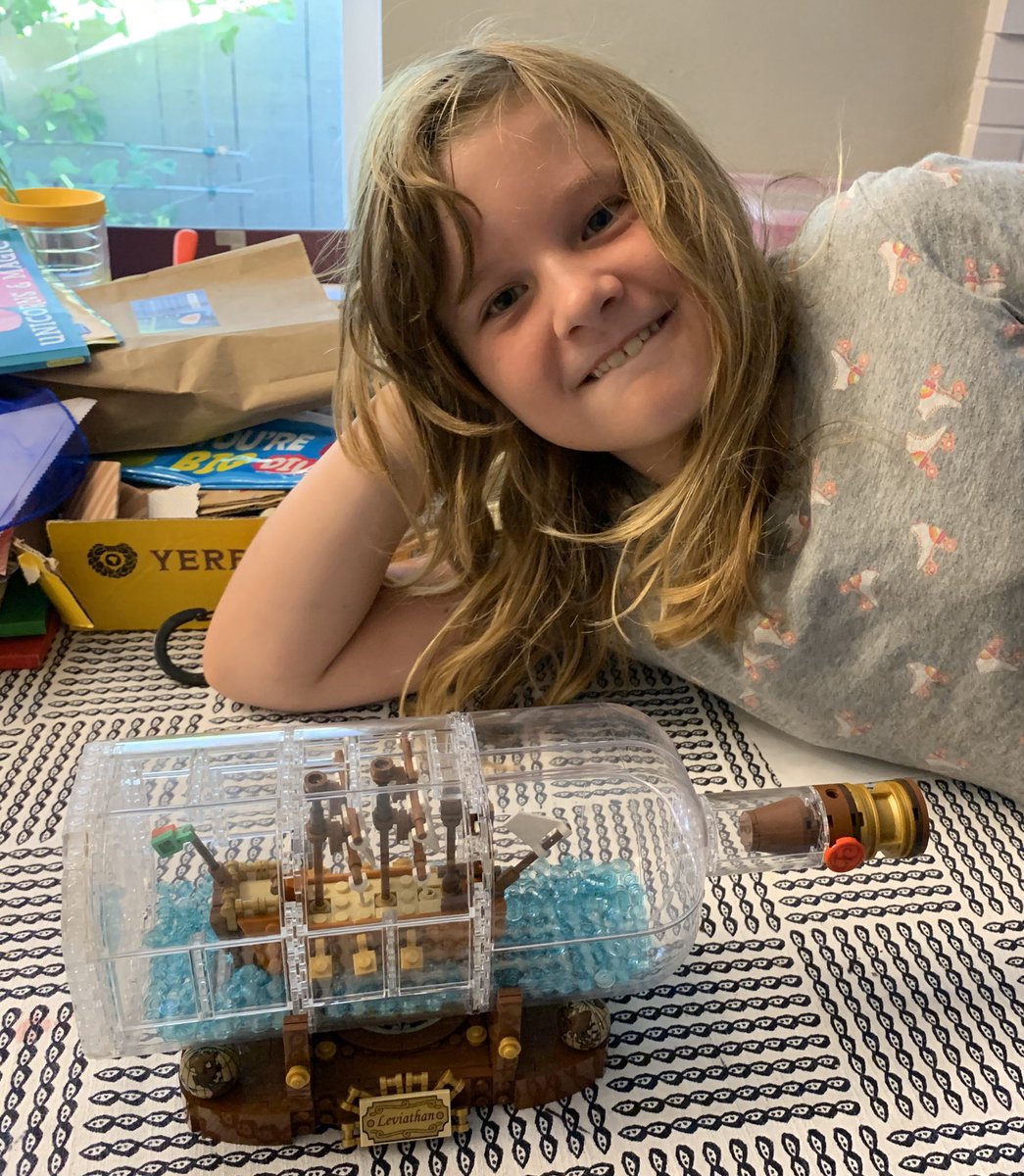 That LEGO ship in a bottle is one wacky build. But it is neat! Built with Maisie https://t.co/L7ghZ0FxWd