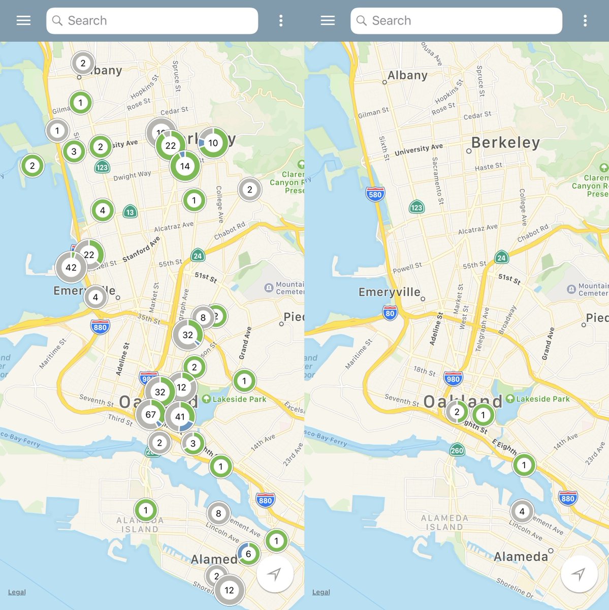 (not showing Tesla superchargers, but there's only one station in Alameda, 12 spots)