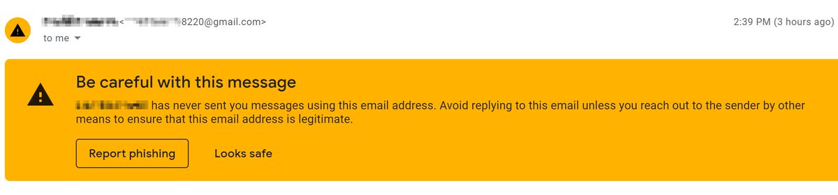 😲 I've never seen this phishing warning in my gmail before. Is it because the email format is `firstlast1234@gmail.com` ? The "generic name plus numbers" format is definitely one spammers use a lot, but this definitely IS NOT a spammer. https://t.co/Hs5cdRZzDl
