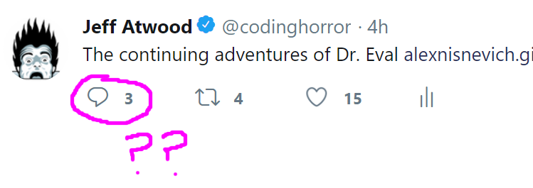 This tweet from 4 hours ago supposedly has 3 replies but I can't see them, either in my twitter account, logged in as a different twitter account, or in anonymous mode. 😵 https://t.co/kMyfd0C1oj