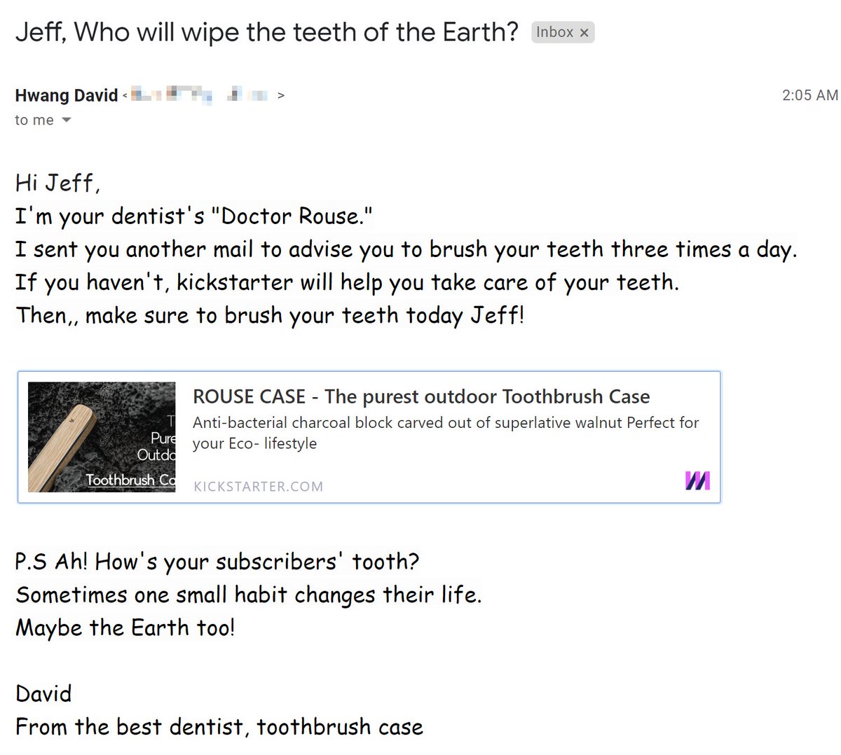 This is the first spam email I've ever gotten that I actually kinda liked. I really should brush my teeth more, thanks for the reminder Hwang David! https://t.co/l4Je6bi68s