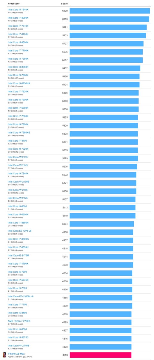 A reckoning is coming -- per Geekbench 4, the iPhone XS is the 43rd fastest processor on the market, despite the vast difference in TDP watts https://t.co/Mo7gZo3kvX