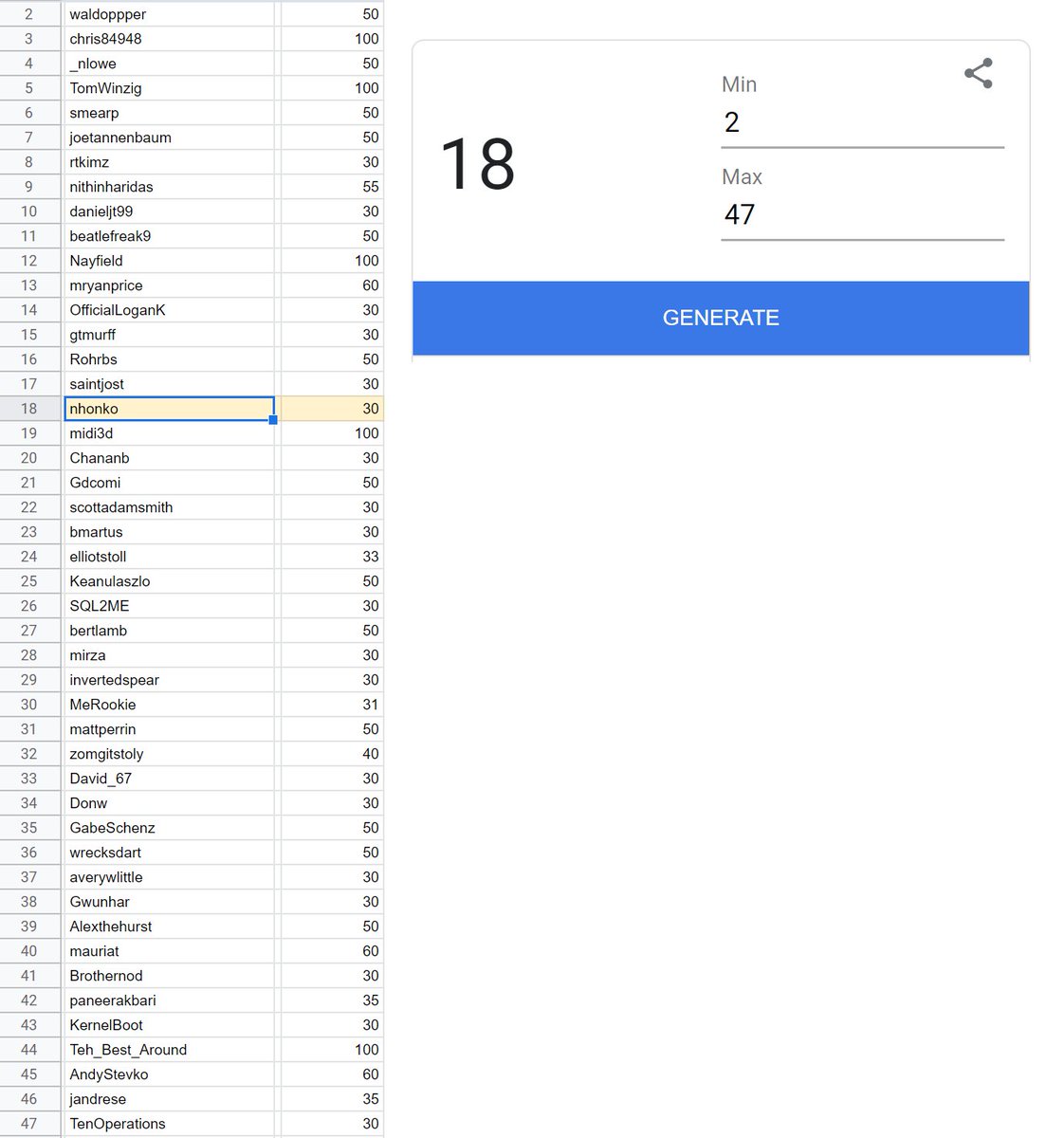 @edanbenatar @nhonko Google Forms has a one-click export to Google Sheets, and I type "random number" into google to get their on-page JS random number generator.