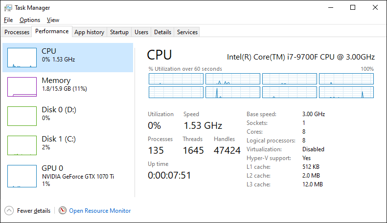 Intel i7-9700F CPU (Noctua NH-L9i fan)
